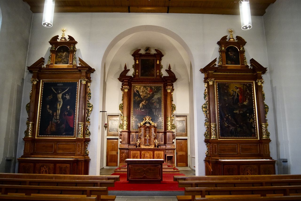Die Klosterkirche, errichtet im Jahr 1657, wurde im Zuge einer umfassenden Innenrenovierung im Jahr 1963 neu gestaltet. Ihre schlichte Gestaltung spiegelt den franziskanischen Geist wider. Die Altäre im frühen Barockstil sind die auffälligsten und wichtigsten Schmuckstücke. Im Einklang mit den Ordensgebräuchen sind sie in natürlichen Holztönen gehalten, aufgelockert durch dezente Goldakzente und Grün. Die Antependien zeugen von der hochwertigen Handwerkskunst des 17. Jahrhunderts und sind mit kostbaren, naturfarbenen Holzintarsien verziert.